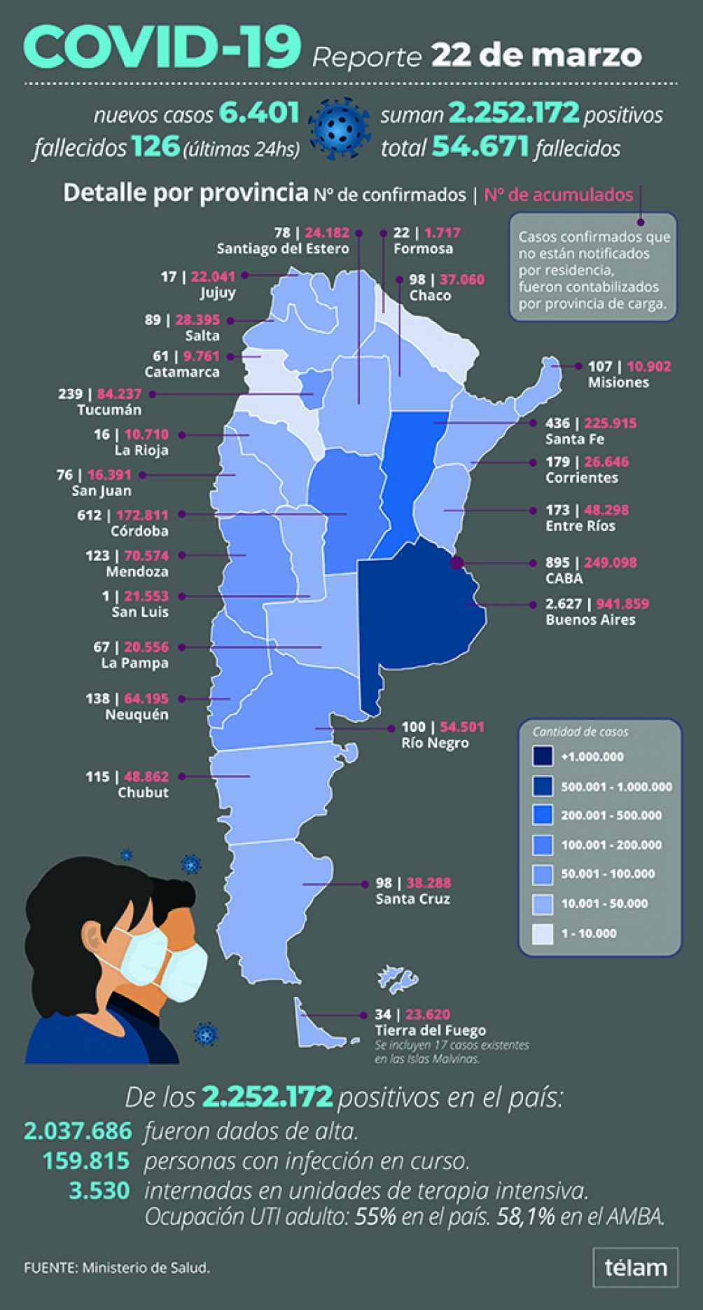 Otras 126 personas murieron y 6.401 fueron reportadas con coronavirus en las últimas 24 horas en la Argentina, con lo que suman 54.671 los fallecidos registrados oficialmente a nivel nacional y 2.252.172 los contagiados desde el inicio de la pandemia, informó este lunes el Ministerio de Salud.