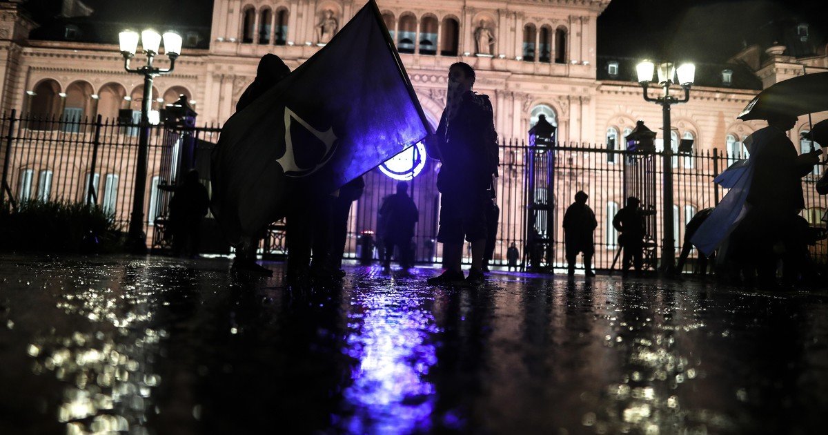 En la entrada en vigor de las nuevas restricciones anunciadas por el Gobierno nacional ante el fuerte aumento de los contagios de coronavirus, un grupo de libertarios se concentró este viernes frente a la Casa Rosada para rechazar las medidas sanitarias.