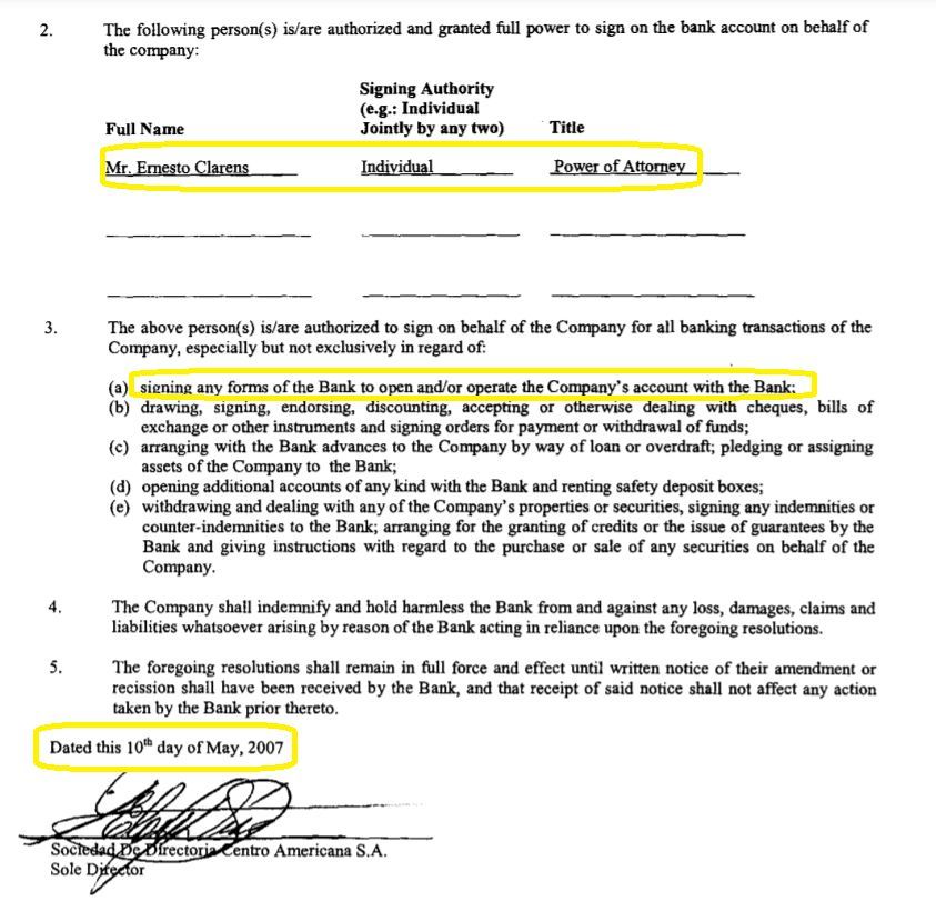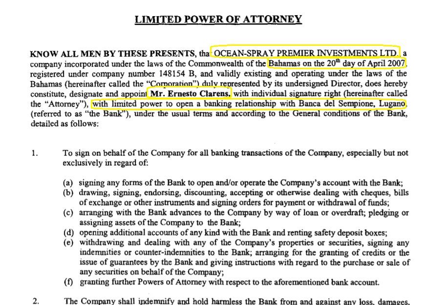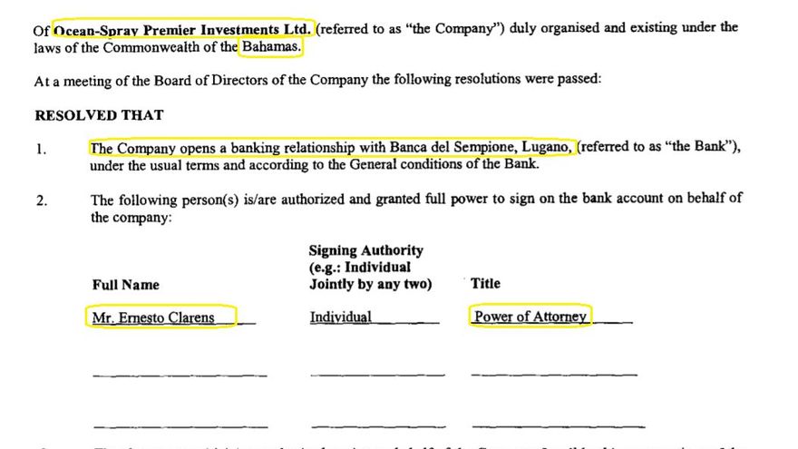 En un documento datado el 10 de mayo de 2007, la sociedad Ocean Spray Premier Ltd., radicada en Bahamas, emitió un poder a Clarens para operar con la Banca del Sempione, en Lugano, Suiza, de acuerdo con los registros que obtuvo el Consorcio Internacional de Periodistas de Investigación (ICIJ), que integra elDiarioAR junto a La Nación e Infobae*. El poder lleva sello, firma de un notario y apostillado diplomático de Panamá, desde donde se tramitó el documento.