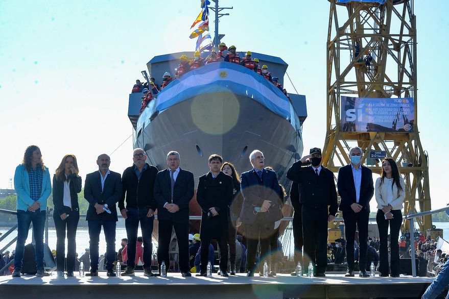 El ministro Taiana y el gobernador Kicillof encabezaron el acto de botadura en el Astillero Río Santiago; todavía faltan colocar las hélices y la línea de eje