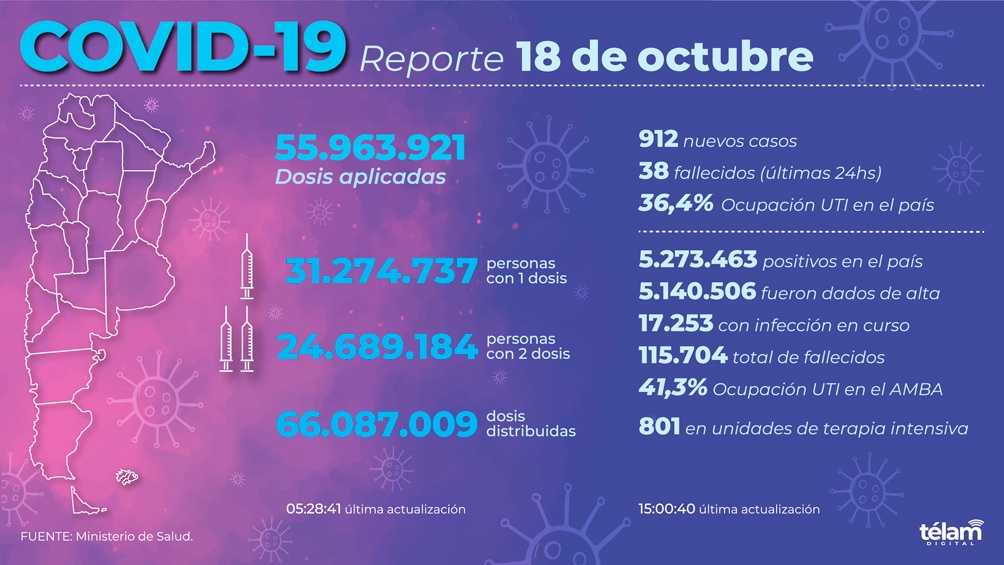 Otras 38 personas murieron y 912 fueron reportadas con coronavirus en las últimas 24 horas en la Argentina, con lo que suman 115.704 los fallecidos registrados oficialmente a nivel nacional y 5.273.463 los contagiados desde el inicio de la pandemia, informó este lunes el Ministerio de Salud.