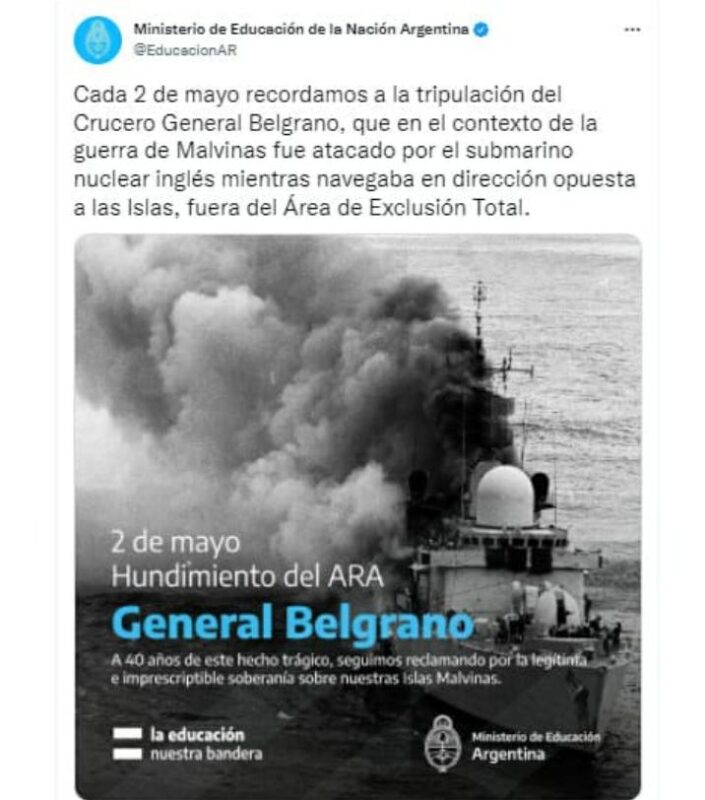 El posteo en Twitter increíblemente respondió a un homenaje que la cartera educativa nacional intentó hacer a 40 años del hundimiento del buque insignia de la flota argentina en Malvinas; el crucero ARA General Belgrano.