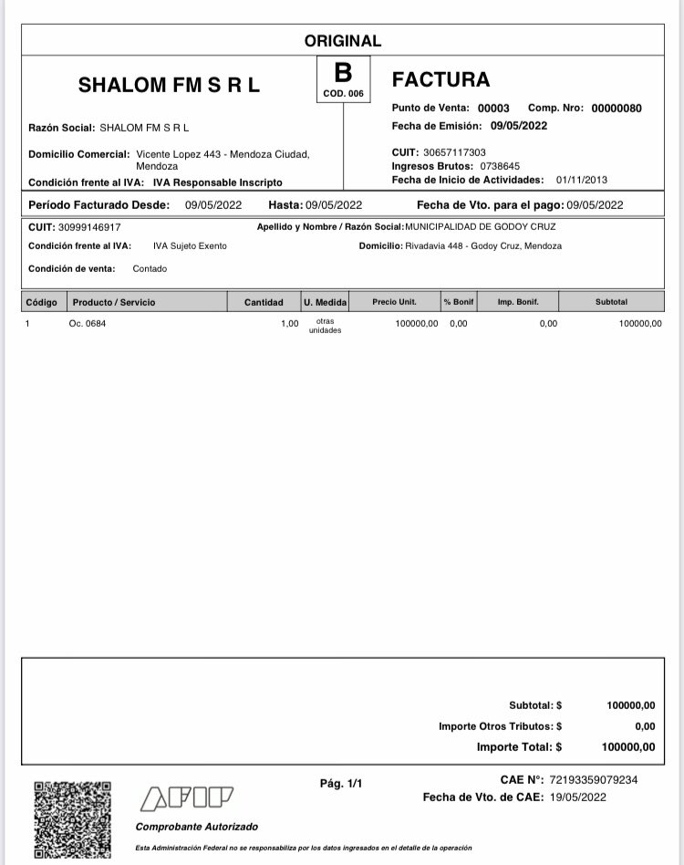 Por caso, se conoció que el intendente Tadeo García Zalazar le dio 400 mil pesos a Radio Shalom en concepto de pauta oficial. Los siguientes documentos, publicados por el portal Bien Cuyano, lo prueban: