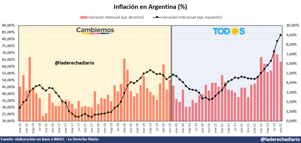 La inflación interanual llegó al 83% en comparación al mismo mes del año pasado, lo cual representa el dato más extremo desde diciembre de 1991. Solamente en lo que va de la presidencia de Alberto Fernández, el nivel de inflación interanual aumentó en casi 30 puntos porcentuales por encima del nivel que había en diciembre de 2019.