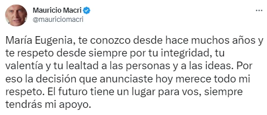 “María Eugenia, te conozco desde hace muchos años y te respeto desde siempre por tu integridad, tu valentía y tu lealtad a las personas y a las ideas”, expresó el ex mandatario en su cuenta de Twitter.