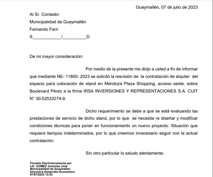 Tras la publicación de Diario Mendoza Today, a los pocos días las alarmas se encendieron y se solicitó al área correspondiente al pedido, a cargo de Jeremías Gómez, la situación del contrato de marras, solicitando la anulación del mismo.