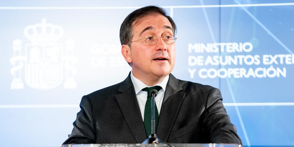 El ministro de Asuntos Exteriores, Unión Europea y Cooperación, José Manuel Albares, realiza una declaración institucional desde el Complejo de la Moncloa.