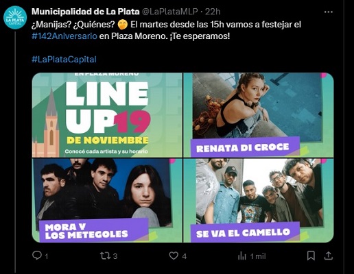 La grilla de actividades propuestas por la Municipalidad de La Plata para el 142 aniversario de la ciudad para el 19 de noviembre se destacan recitales de bandas locales consagradas como Guasones, Los Totora, Peces Raros y Estelares, además de la participación de artistas emergentes como Carmen Sánchez Viamonte y Mora y los Metegoles.