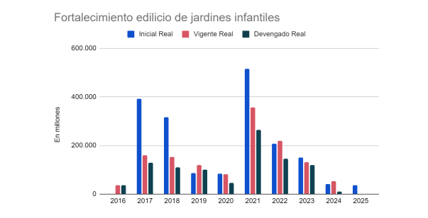 Por otra parte, disminuye un 30% el fortalecimiento edilicio de jardines infantiles respecto al presupuesto vigente de 2024 y un 69% en relación con lo ejecutado en 2023.
