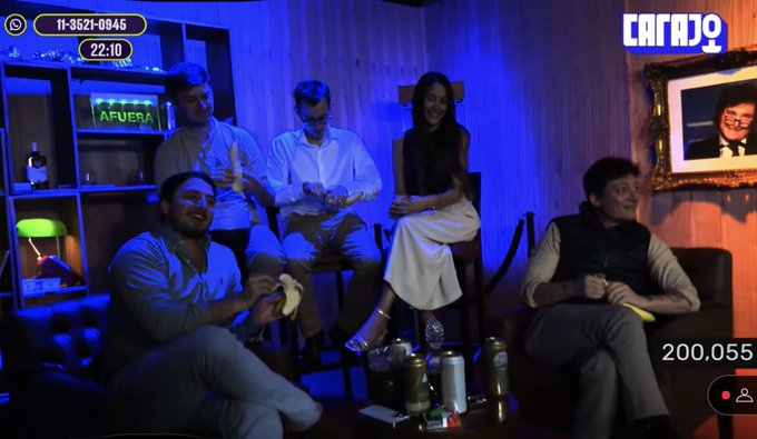Era una ocasión especial para el programa porque cumplía 100 episodios. Cuando arrancó la transmisión, y bajo el sonido de la canción In the jungle, de la película El Rey León, primero mostraron un ploteo de un mandril al lado de la Argentina (ya que aseguran, irónicamente, que son parte de “mandrilandia”), después un cuadro de Milei, una motosierra, un cartel con la palabra “afuera”, y una estatua de un león.