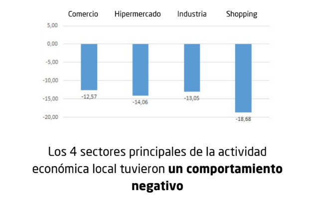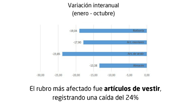 En el último mes evaluado, la caída fue del 5,6% en relación a lo vendido en octubre de 2023. Los rubros más afectados por el extraordinario descenso de la actividad comercial fueron los artículos de vestir (-23,8%), rotisería (-19%), artículos escolares (-17,9%) y almacén (-13,4%).