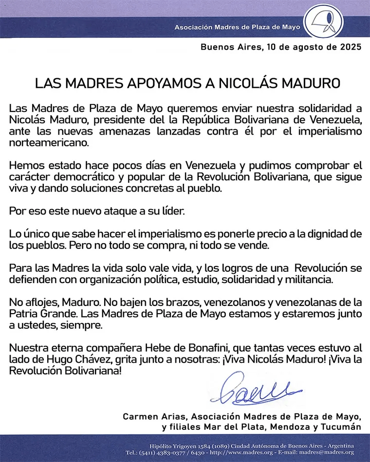 Buenos Aires, 12 de agosto de 2025-Total News Agency-TNA–La Asociación Madres de Plaza de Mayo expresó su firme respaldo al presidente venezolano Nicolás Maduro en medio de las crecientes tensiones con Estados Unidos, donde el gobierno de Donald Trump elevó una recompensa por su captura de 25 a 50 millones de dólares, acusándolo de ser uno de los mayores narcotraficantes del mundo. En un extenso comunicado difundido a través de sus redes sociales, la organización argentina condenó las “amenazas del imperialismo norteamericano” y envió un mensaje de solidaridad al líder bolivariano, instándolo a “no aflojar” en la defensa de la Revolución Bolivariana.