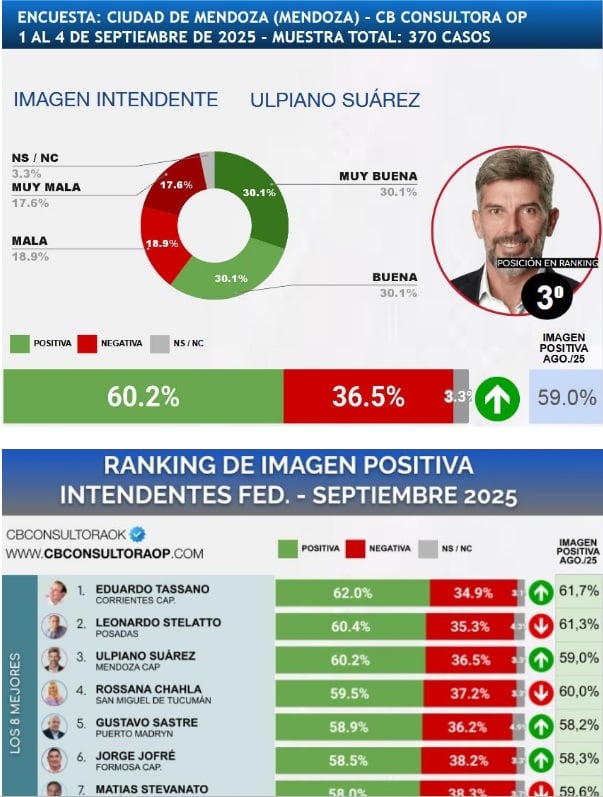 Según el informe: “Los tres intendentes mejor valorados del mes de septiembre de 2025 por sus vecinos son: en primer lugar, Eduardo Tassano (Corrientes Capital) con un 62,0% de imagen positiva, seguido por Leonardo Stelatto (Posadas) con un 60,4%, y en tercer lugar Ulpiano Suarez (Mendoza Capital) con un 60,2% de aprobación”.