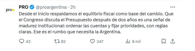 “Desde el inicio respaldamos el equilibrio fiscal como base del cambio. Que el Congreso discuta el Presupuesto después de dos años es una señal de madurez institucional: ordenar las cuentas y fijar prioridades, con reglas claras. Ese es el rumbo que necesita la Argentina”, dieron a conocer desde el PRO en un comunicado difundido en X.