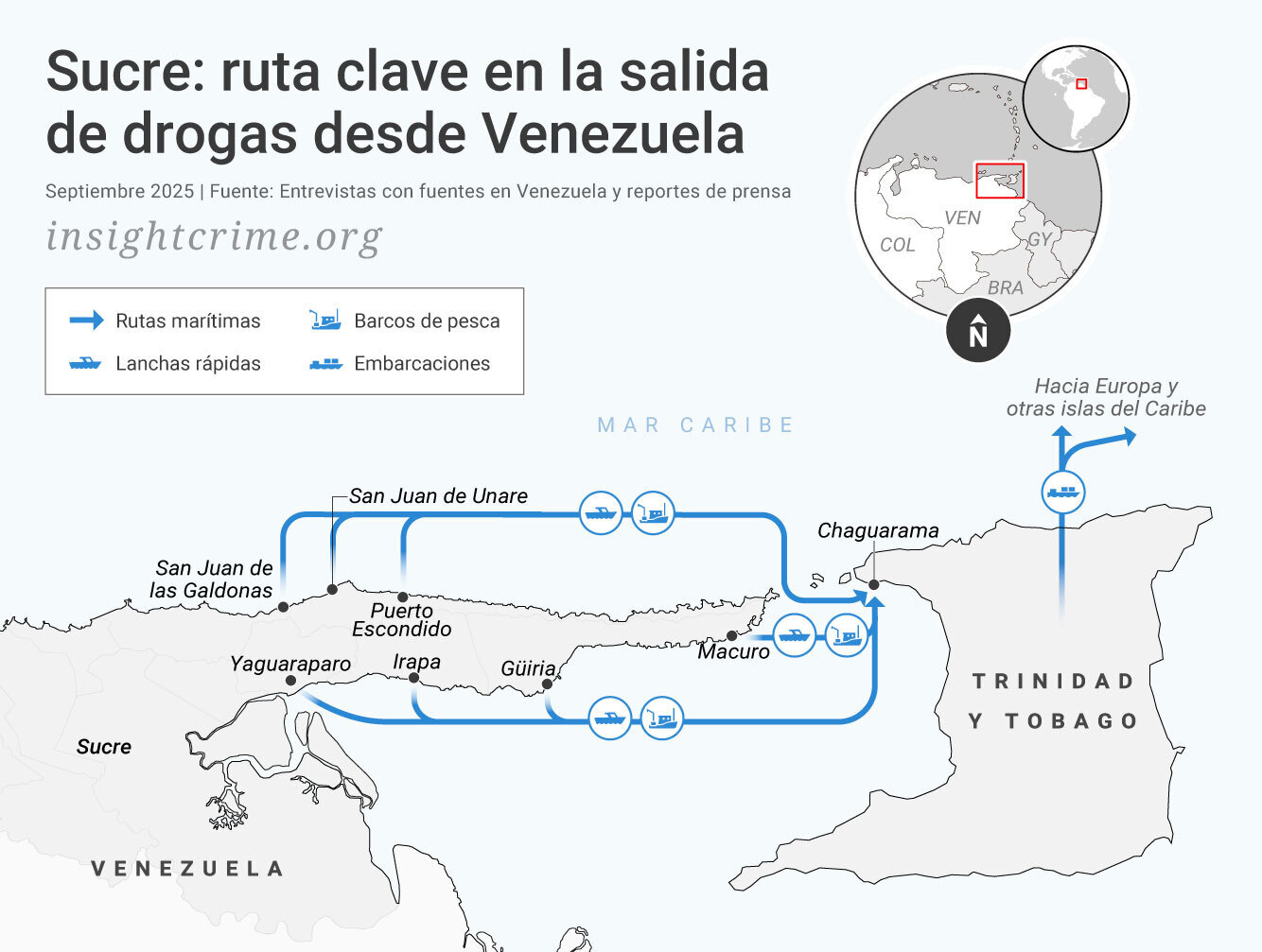 La embarcación habría partido del municipio Arismendi, en la península de Paria, un corredor clave para el contrabando de cocaína, armas y migrantes hacia Trinidad y el Caribe oriental. En localidades como Valdez y Cajigal, vecinos aseguran que es común ver lanchas cargadas con droga que luego continúan hacia destinos internacionales.