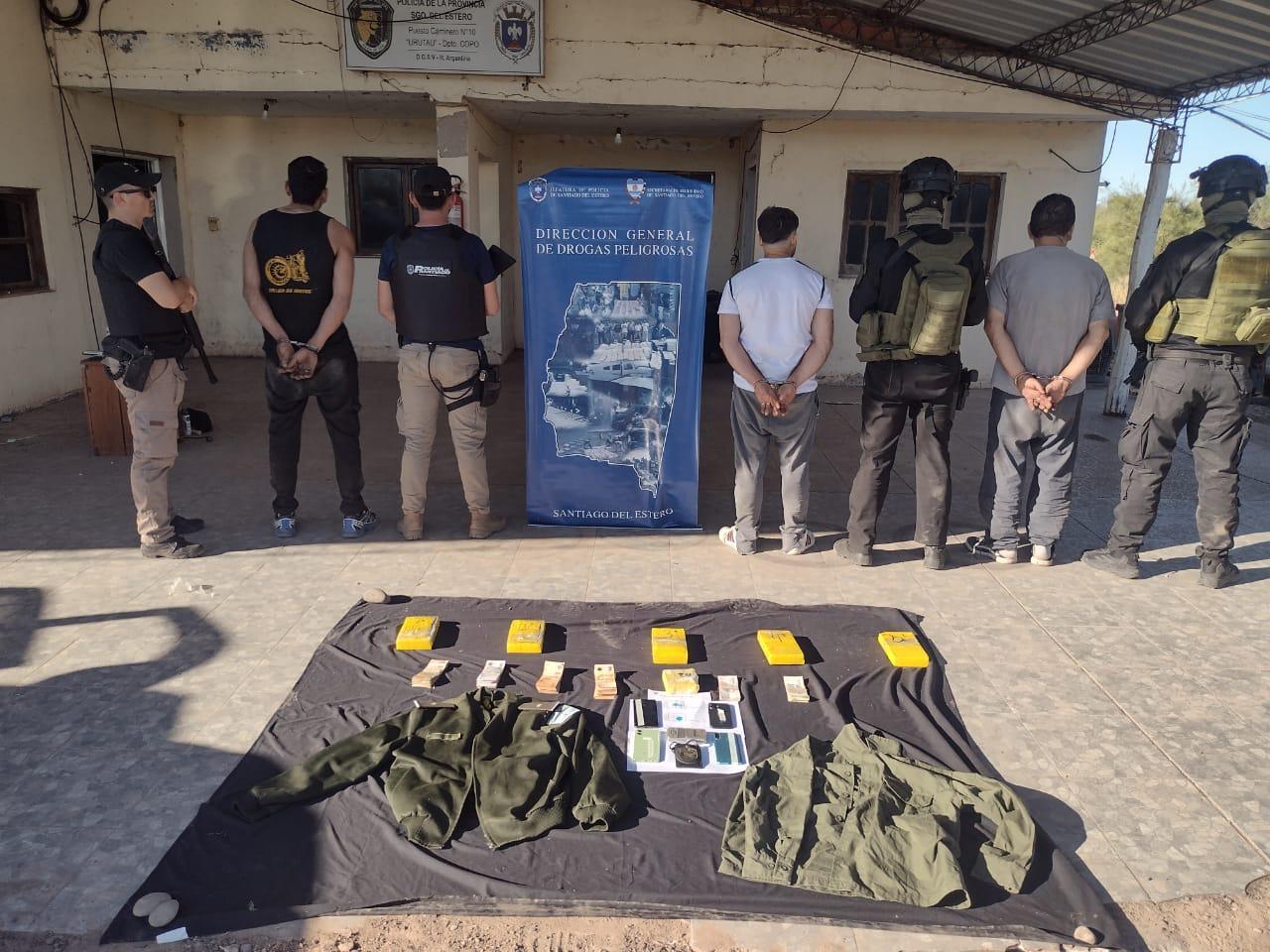 Del operativo surgió el secuestro de la camioneta Toyota Hilux, $831.400 en efectivo, 2.000 guaraníes paraguayos, cuatro teléfonos celulares de alta gama, ropa perteneciente al gendarme y su credencial oficial, además de los cinco paquetes de cocaína. Los detenidos quedaron imputados por infracción a la Ley 23.737 de Estupefacientes y fueron trasladados bajo un fuerte operativo de seguridad hacia la capital santiagueña.
