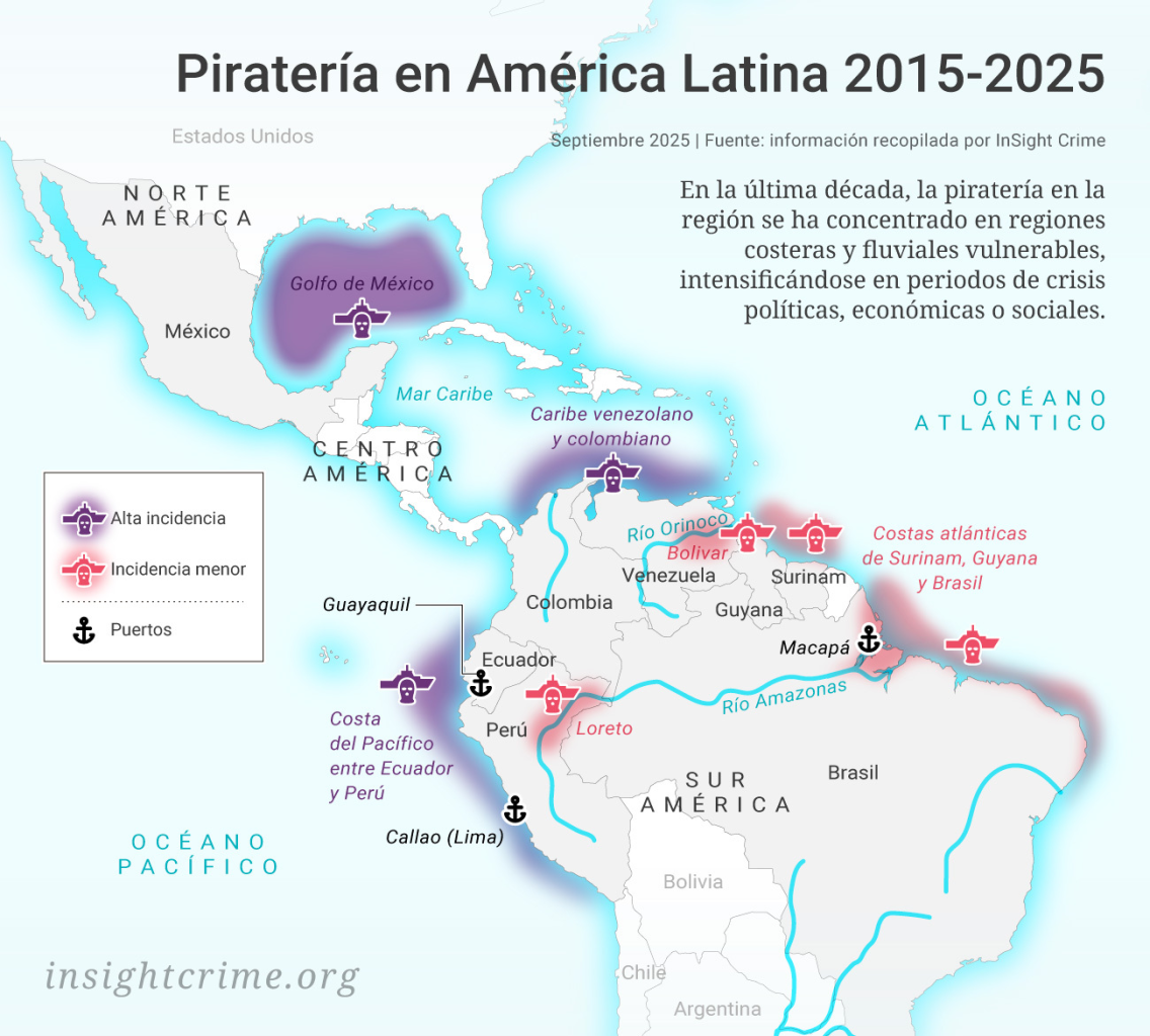 En América Latina, entre el 10 % y el 15 % de los incidentes de piratería mundial tienen lugar en sus aguas, de acuerdo con el investigador Brandon Prins. Aunque estas cifras son menores que en áreas como África Oriental o el Sudeste Asiático, la región ha atravesado picos alarmantes en la última década, particularmente en momentos de crisis económica o sanitaria.