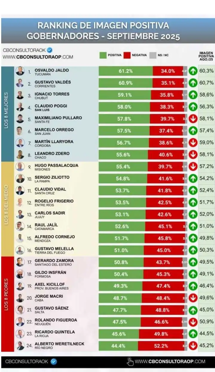 Según el estudio de CB Consultora Opinión Pública, el gobernador tucumano Osvaldo Jaldo, fue el más valorado con una imagen positiva del 61,2%. Le siguió el correntino Gustavo Valdés con 60,9%, y más atrás apareció el chubutense Ignacio Torres con 59,1%.
