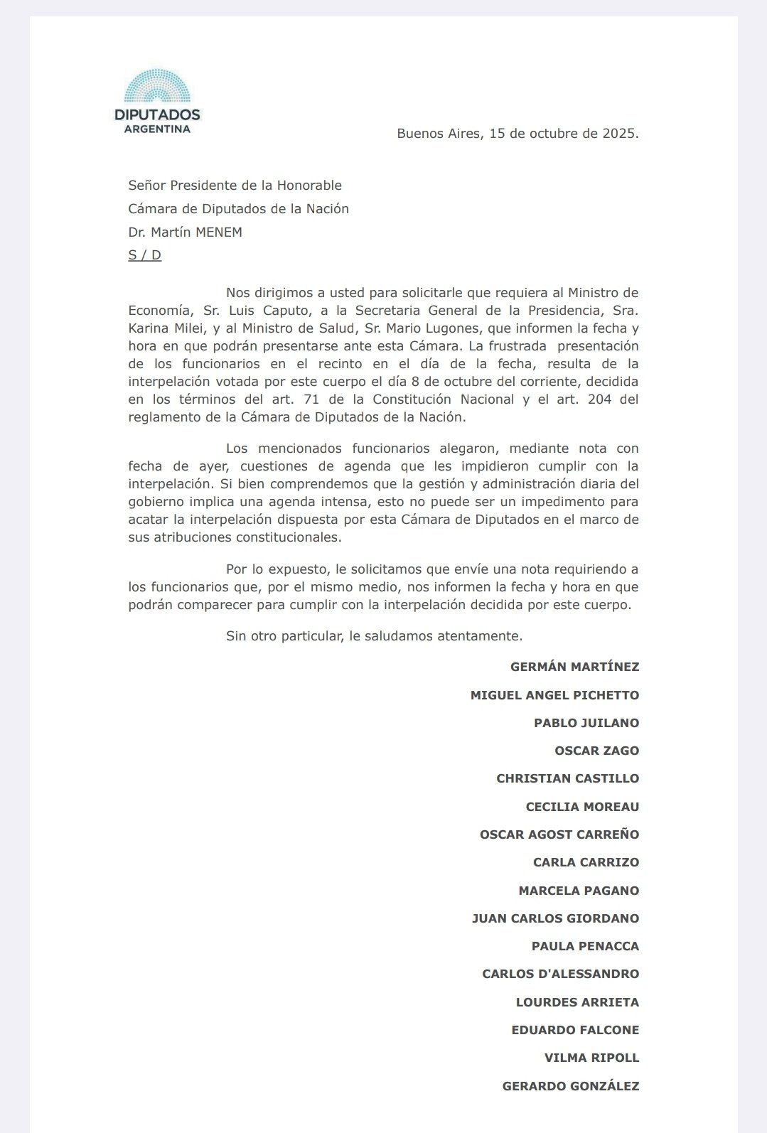 “La frustrada presentación de los funcionarios en el recinto en el día de la fecha, resulta de la interpelación votada por este cuerpo el día 8 de octubre del corriente, decidida en los términos del artículo 71 de la Constitución Nacional y el artículo 204 del reglamento de la Cámara de Diputados de la Nación”, se lee en la misiva a la que accedió Mendoza Today.