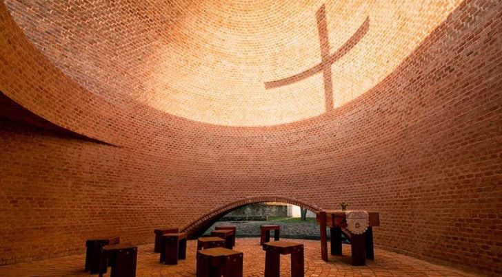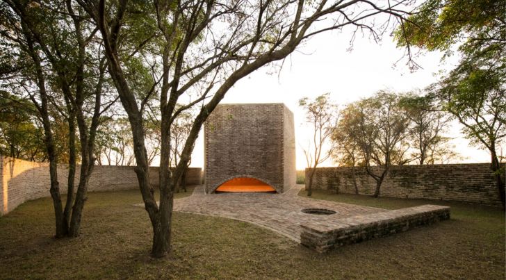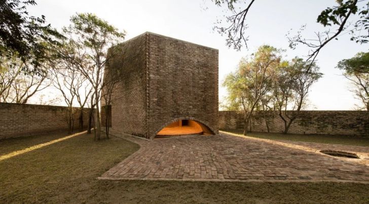 La gran construcción de ladrillo se abre hacia la puesta del sol para captar la luz natural, mientras una abertura cenital en el techo permite seguir el recorrido solar a lo largo del día.