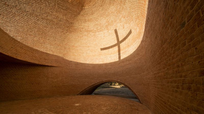 La gran construcción de ladrillo se abre hacia la puesta del sol para captar la luz natural, mientras una abertura cenital en el techo permite seguir el recorrido solar a lo largo del día.