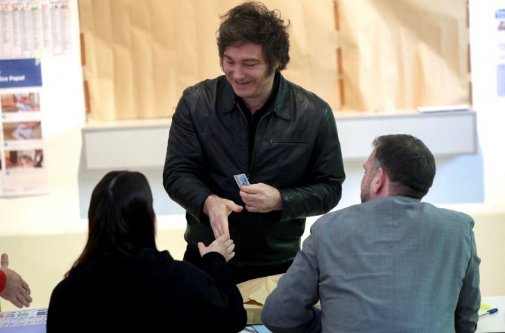 El libertario arribó a las inmediaciones de Medrano y Córdoba con su tradicional campera de cuero y remera negra. Posteriormente, esperó unos minutos hasta emitir su voto en la mesa 2211.