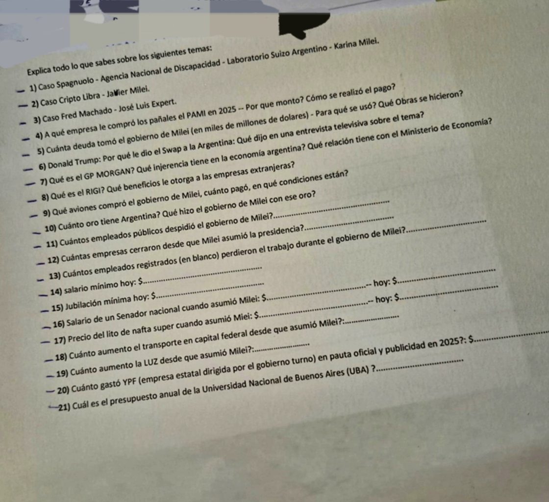 Si se hace una simple lectura de las preguntas, lo que quiere demostrar el “profesor”, a través de las respuestas de los alumnos, a modo de conclusión deductiva general, es que el gobierno de Milei es negativo, malo, pésimo, o alguna otra calificación maligna. Sr, “Profesor” no estamos en Cuba, ni Venezuela, ni en Rusia. Si Usted quiere “hacer adoctrinamiento político” con los estudiantes, y con el agravante de ser menores de edad, le aconsejo que saque un pasaje a dichos países que con gusto lo recibirán y seguramente le darán una medalla al mérito. En Argentina, gracias a Dios, existe libertad de prensa y de expresión, por lo que sería mucha más democrático que sus críticas u opiniones al gobierno de turno, las canalice a través de los medios adscriptos al kirchnerismo, que son muchos y con abundante financiamiento de dudoso orígen, dado que su jefa está presa por corrupción. Pero utilizar las aulas para “pescar” o adoctrinar adeptos es una actitud como mínimo incalificable, despreciable, que roza con lo ilegal y antijurídico.