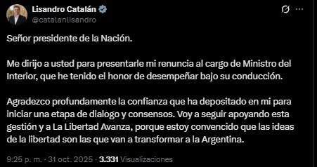 Mediante un mensaje por redes sociales, Lisandro Catalán anunció su renuncia al ministerio del Interior. Lo comunicó este viernes por la noche, pocos minutos después de que Guillermo Francos presente su dimisión a la Jefatura de Gabinete.