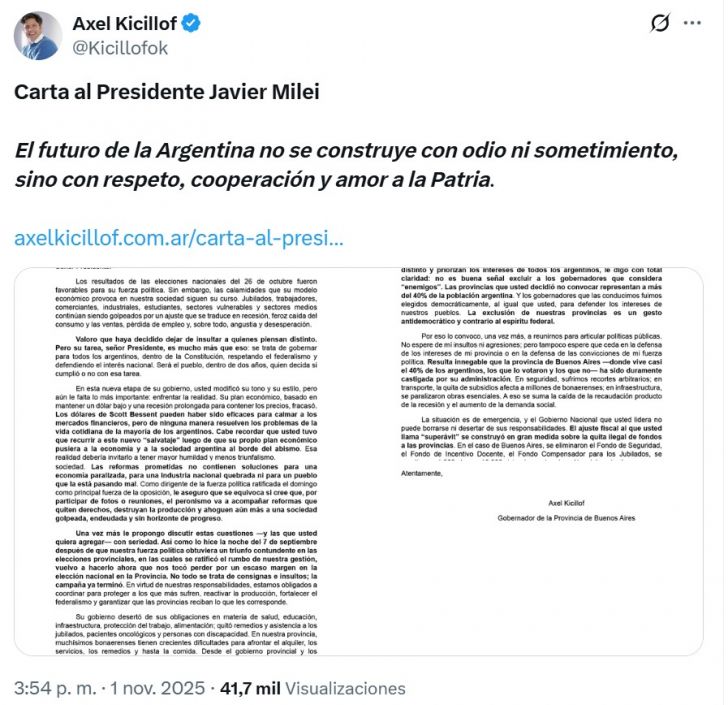 Buenos Aires, 1 de noviembre de 2025-Total News Agency-TNA-. El gobernador bonaerense, Axel Kicillof, publicó una carta pública dirigida al presidente Javier Milei en la que cuestionó con dureza el modelo económico del Gobierno nacional y, tras su exclusión de la reunión con mandatarios en la Casa Rosada, pidió la apertura de un “diálogo genuino” que incluya a todos los sectores y respete el federalismo. En su mensaje, advirtió que la recesión, la caída del consumo y el aumento de la angustia social persisten más allá del cambio de tono presidencial, y calificó como “mala señal” el criterio de convocatoria utilizado por el Ejecutivo.