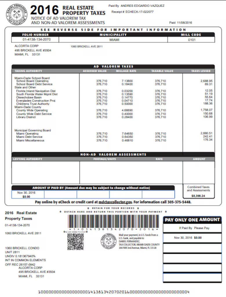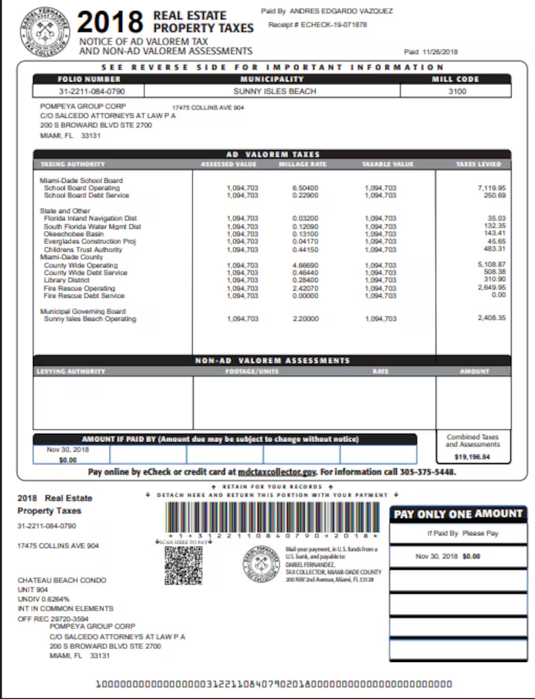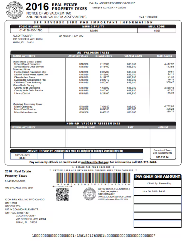 Buenos Aires, 8 de noviembre de 2025 – Total News Agency-TNA-Andrés Edgardo Vázquez, titular de la Dirección General Impositiva (DGI), quedó en el centro de un nuevo escándalo tras la difusión de documentos oficiales del condado de Miami-Dade que lo muestran pagando con cheques electrónicos a su nombre los impuestos inmobiliarios de tres condominios en Florida entre 2014 y 2018, inmuebles que no figurarían en sus declaraciones juradas ante la Oficina Anticorrupción. Las unidades están ubicadas en los edificios Icon Brickell (avenidas Brickell 495 y 1060) y en Chateau Beach Residences de Sunny Isles (Collins 17.475), con valuaciones que superan en conjunto los dos millones de dólares.