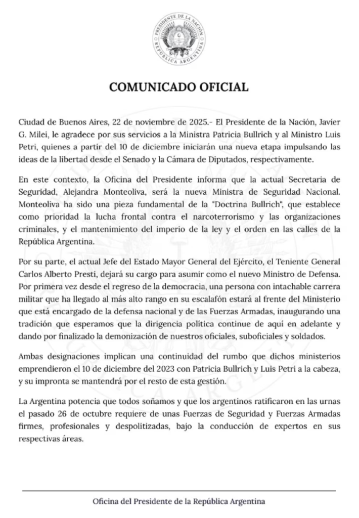 Buenos Aires, 22 de noviembre de 2025 – Total News Agency-TNA-El Gobierno nacional confirmó este sábado los reemplazos que ocuparán los ministerios de Seguridad y Defensa a partir del próximo 10 de diciembre, fecha en que Patricia Bullrich y Luis Petri dejarán sus cargos para asumir sus bancas legislativas. La decisión, comunicada simultáneamente por la Oficina del Presidente y los propios funcionarios salientes, marca un giro institucional significativo y consolida la línea política que la administración Milei denomina “continuidad del rumbo”.