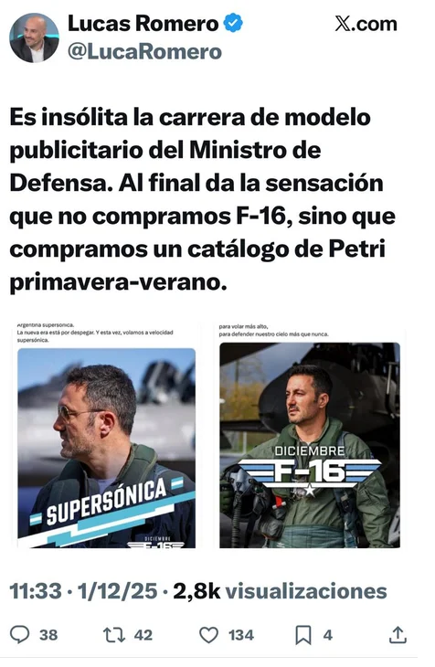 “Es insólita la carrera de modelo publicitario del Ministro de Defensa. Al final da la sensación que no compramos F-16, sino que compramos un catálogo de Petri primavera-verano“, tuiteó Romero.