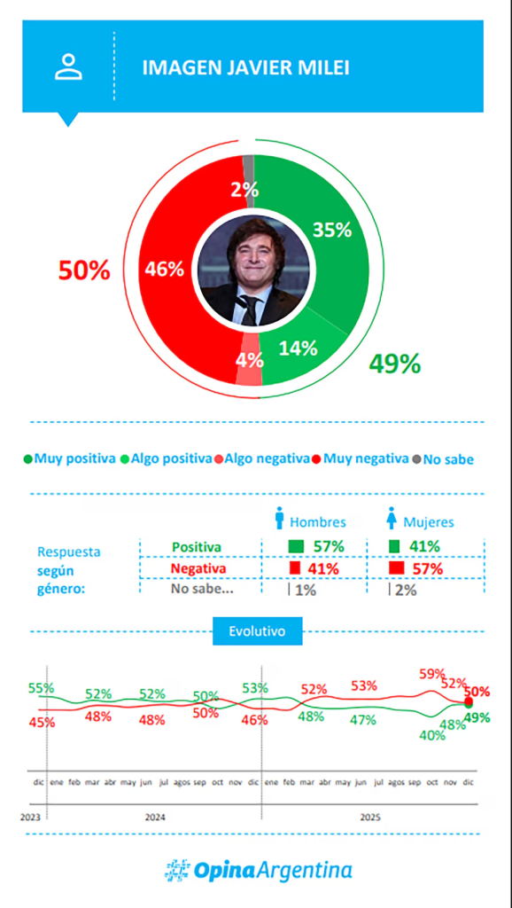 Buenos Aires, 6 de diciembre de 2025 – Total News Agency-TNA-El año político termina con un dato que consolida el clima de respaldo que el Gobierno buscó sostener tras las elecciones de octubre: Javier Milei mantiene 49% de imagen positiva, según un relevamiento de Opina Argentina, y llega a la mitad de su mandato mejor posicionado que Mauricio Macri y Alberto Fernández en el mismo punto de sus presidencias. El sondeo, realizado entre el 1° y el 3 de diciembre sobre 1.772 personas, muestra una sociedad partida en mitades, pero con un núcleo de apoyo al Presidente que se ha mantenido prácticamente inalterado desde diciembre de 2023.