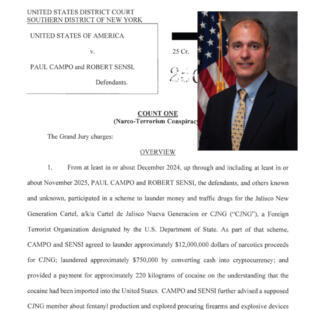 Nueva York, 11 de diciembre de 2025 – Total News Agency-TNA-Un ex alto funcionario de la Administración para el Control de Drogas (DEA) de Estados Unidos, Paul Campo, fue arrestado y enfrenta un gravísimo procesamiento federal por presuntamente conspirar con el Cártel Jalisco Nueva Generación (CJNG) para lavar dinero, facilitar el tráfico de cocaína y coordinar apoyo material a una organización criminal designada como terrorista extranjera, informaron fuentes judiciales y federales. La acusación fue presentada ante una corte federal en el Distrito Sur de Nueva York y detallada por fiscales que describieron un esquema de actividad criminal en el que el ex agente, junto con su presunto colaborador Robert Sensi, habría usado su experiencia en la aplicación de la ley para asistir a una de las estructuras del narcotráfico más violentas y expandidas de México y Estados Unidos, pudo saber TNA.
