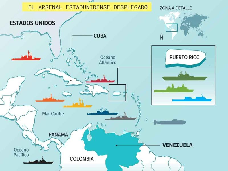 El despliegue militar estadounidense en el Caribe refuerza el mensaje político. Actualmente, Estados Unidos mantiene en la zona cuatro escuadrones de aviones de combate, un escuadrón de aeronaves de alerta temprana, helicópteros antisubmarinos y antibuque, además del submarino USS Newport News y el destructor lanzamisiles USS Thomas Hudner. Fuentes militares subrayan que este dispositivo no solo busca controlar el tráfico petrolero, sino también interceptar rutas de narcotráfico y contrabando que operan desde territorio venezolano.