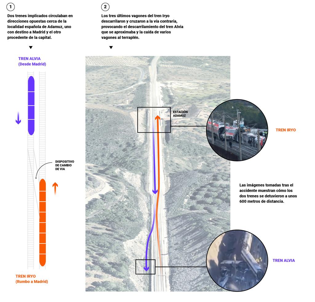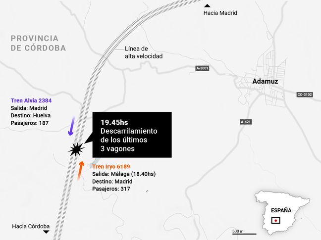 El accidente se produjo cuando un tren de alta velocidad de la empresa Iryo, que cubría el trayecto Málaga–Madrid con 317 pasajeros a bordo, descarriló a la altura de la localidad de Adamuz. Tras salirse de la vía, la formación se cruzó de carril e impactó a unos 200 kilómetros por hora contra otro tren de alta velocidad de la empresa estatal Renfe, que circulaba en sentido contrario con destino a Huelva. El choque provocó el descarrilamiento de ambos convoyes y una destrucción masiva de varios vagones.