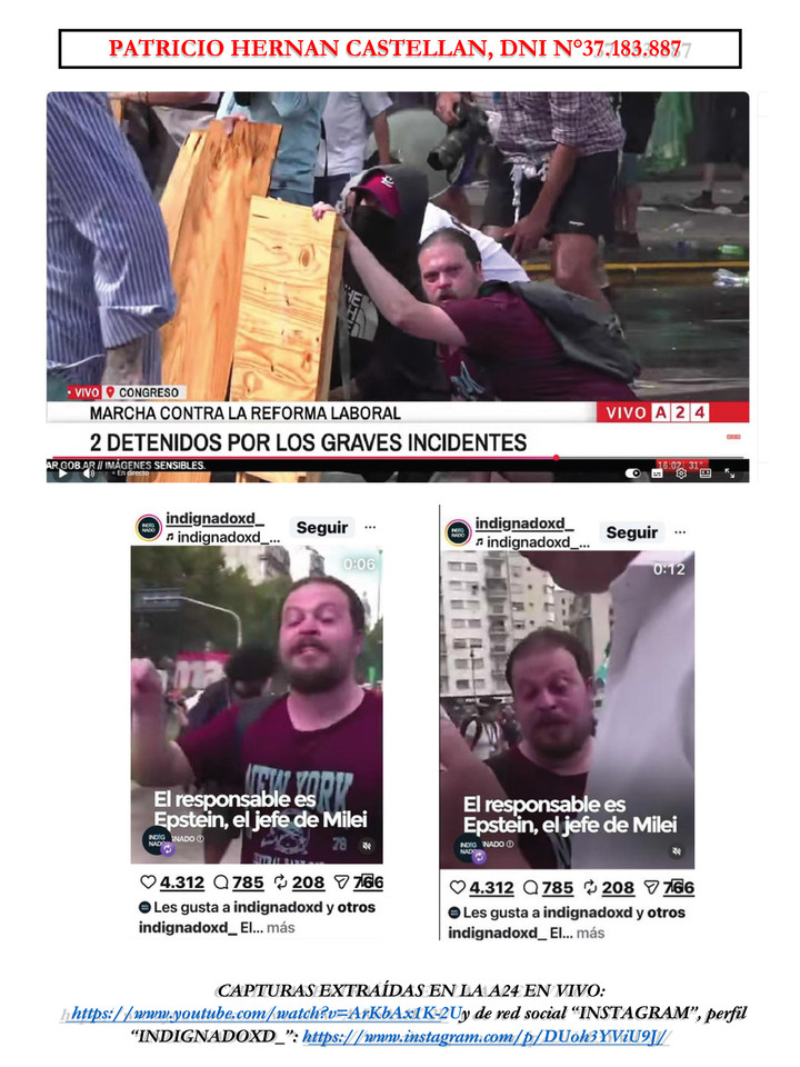 El tercer acusado, Federico Alberto Mazzagalli (42), domiciliado en el barrio porteño de Caballito, fue presentado por el Gobierno como un engranaje clave en el núcleo de la “trinchera”, pese a que en sus perfiles públicos se autodefine con consignas vinculadas a la no violencia. En el plano político, se remarcó que habría promovido convocatorias contra el proyecto laboral y difundido expresiones de fuerte crítica al presidente Javier Milei en posteos anteriores, un punto que el oficialismo incluyó para sostener que los hechos tuvieron intencionalidad desestabilizadora. El cuarto implicado, Patricio Hernán Castellán (33), de Lomas de Zamora, fue identificado en imágenes de cobertura periodística y se viralizó por declaraciones realizadas a los gritos en medio de la protesta.