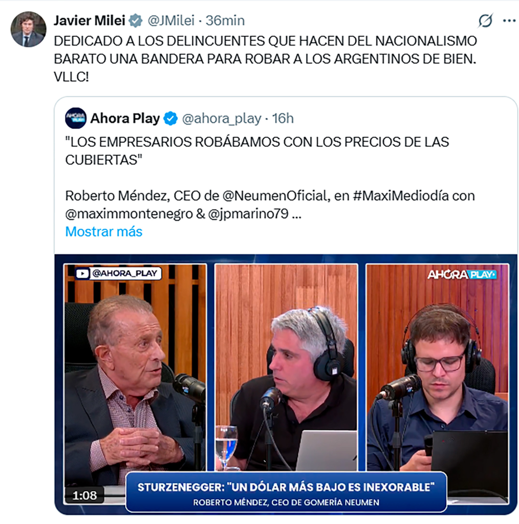 Buenos Aires-25 de febrero de 2026-Total News Agency-TNA- Una frase dicha sin maquillaje sacudió al mundo empresario y al bolsillo de los automovilistas: el CEO de Neumen, Roberto Méndez, admitió que durante los años de fuertes restricciones a la importación de neumáticos el sector operó con rentabilidades extraordinarias y remarcaciones que hoy resultan difíciles de justificar. “Estábamos robando con el precio de las cubiertas”, dijo en una entrevista que se viralizó y que terminó escalando a la arena política con una respuesta directa del presidente Javier Milei, quien aprovechó el episodio para cargar contra lo que define como “nacionalismo barato” usado como cobertura para abusos de precios.
