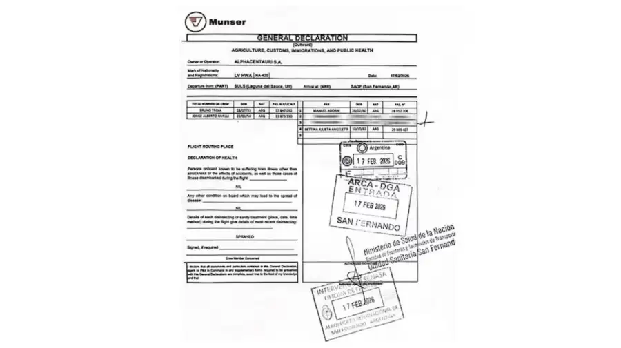Según la información difundida en las últimas horas, Adorni viajó a Uruguay entre el 12 y el 17 de febrero en un Honda Jet matrícula LV-HWA, operado por la firma Alpha Centauri. El vuelo partió desde el aeropuerto de San Fernando y aterrizó en Laguna del Sauce, en Punta del Este, para luego regresar días después en la misma aeronave, aunque en el tramo de vuelta ya no habría viajado Grandio. La principal incógnita sigue siendo quién abonó efectivamente el costo del traslado y en qué condiciones se realizó esa contratación.