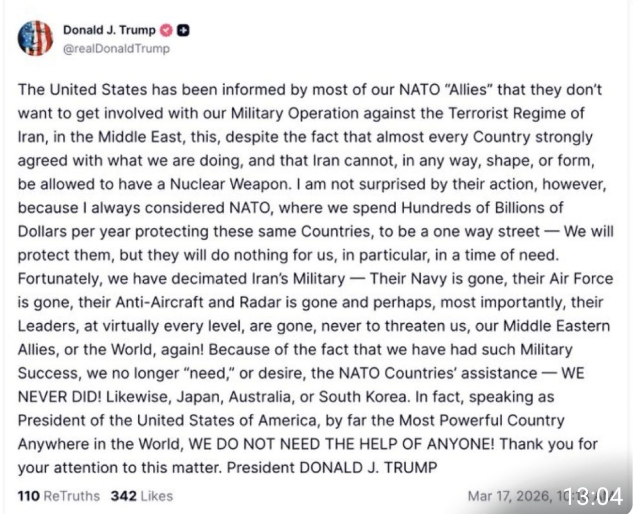 Washington-17 de Marzo de 2026-Total News Agency-TNA- Un nuevo mensaje de Donald Trump volvió a exponer la tensión creciente entre Estados Unidos y varios de sus aliados tradicionales a raíz de la guerra contra Irán. El presidente norteamericano sostuvo este martes que la mayoría de los países de la OTAN no quiere involucrarse en la operación militar en Medio Oriente, calificó esa postura como “un error muy tonto” y remarcó que, tras el éxito militar alcanzado, Washington ya no “necesita” ni desea la asistencia de la alianza atlántica. También extendió esa idea a socios estratégicos como Japón, Australia y Corea del Sur, en una señal de fuerte autosuficiencia política y militar.