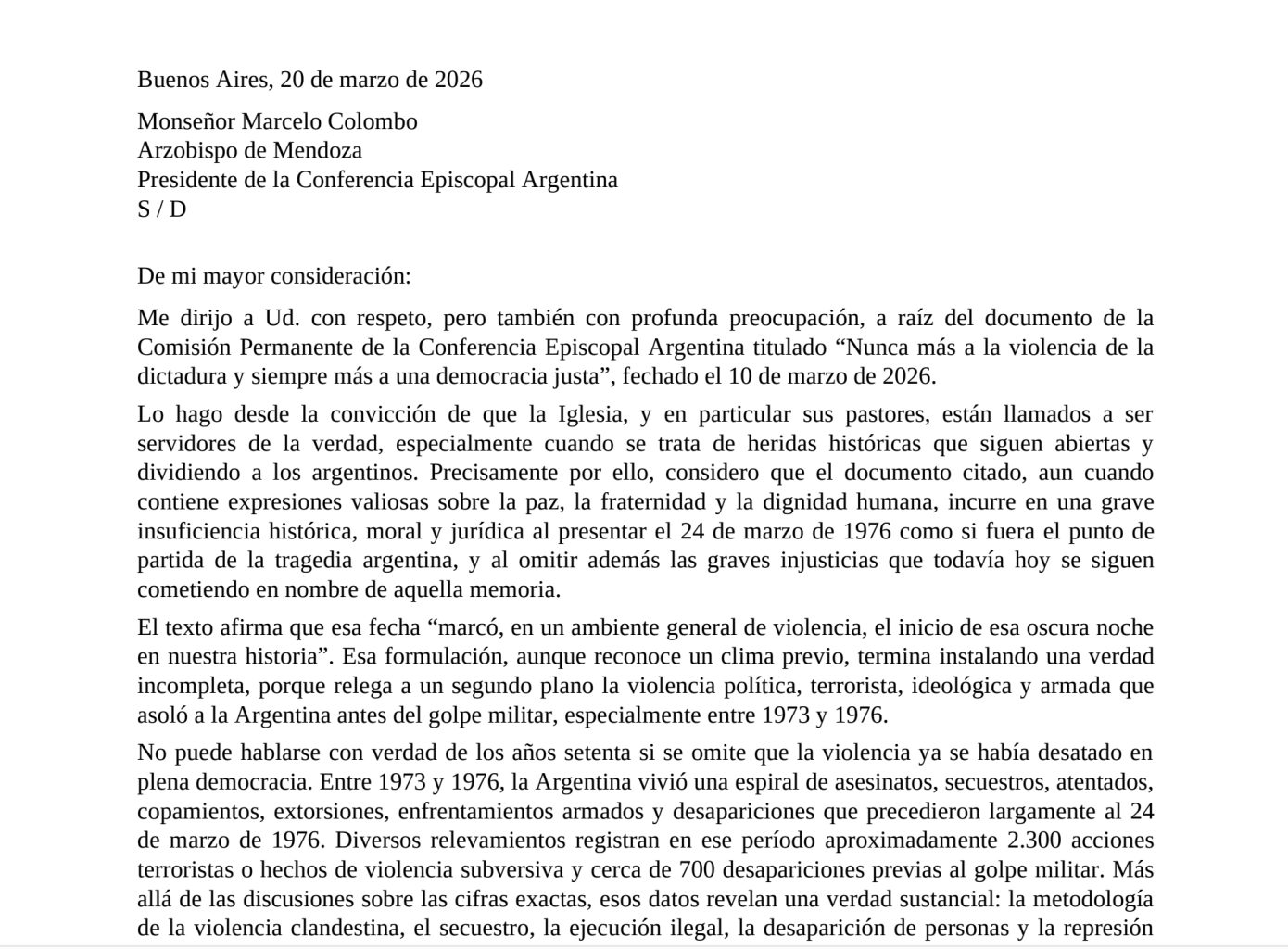 El cierre de la carta mantiene el tono respetuoso, pero deja una conclusión terminante. Figueroa afirma que el documento episcopal, en lugar de ayudar a sanar desde la verdad, vuelve a encerrar a muchos argentinos en una visión fragmentada, ideologizada o insuficiente del pasado. Frente a ello, reclama pastores capaces de mirar la historia sin odio, pero también sin mutilaciones; sin espíritu revanchista, pero sin silencios selectivos; con caridad, sí, aunque inseparable de la verdad y de la justicia. En ese marco, su mensaje a monseñor Colombo no se presenta como una impugnación frontal, sino como una exhortación a revisar las omisiones que, a su criterio, siguen impidiendo una memoria completa, una justicia imparcial y una reconciliación auténtica.