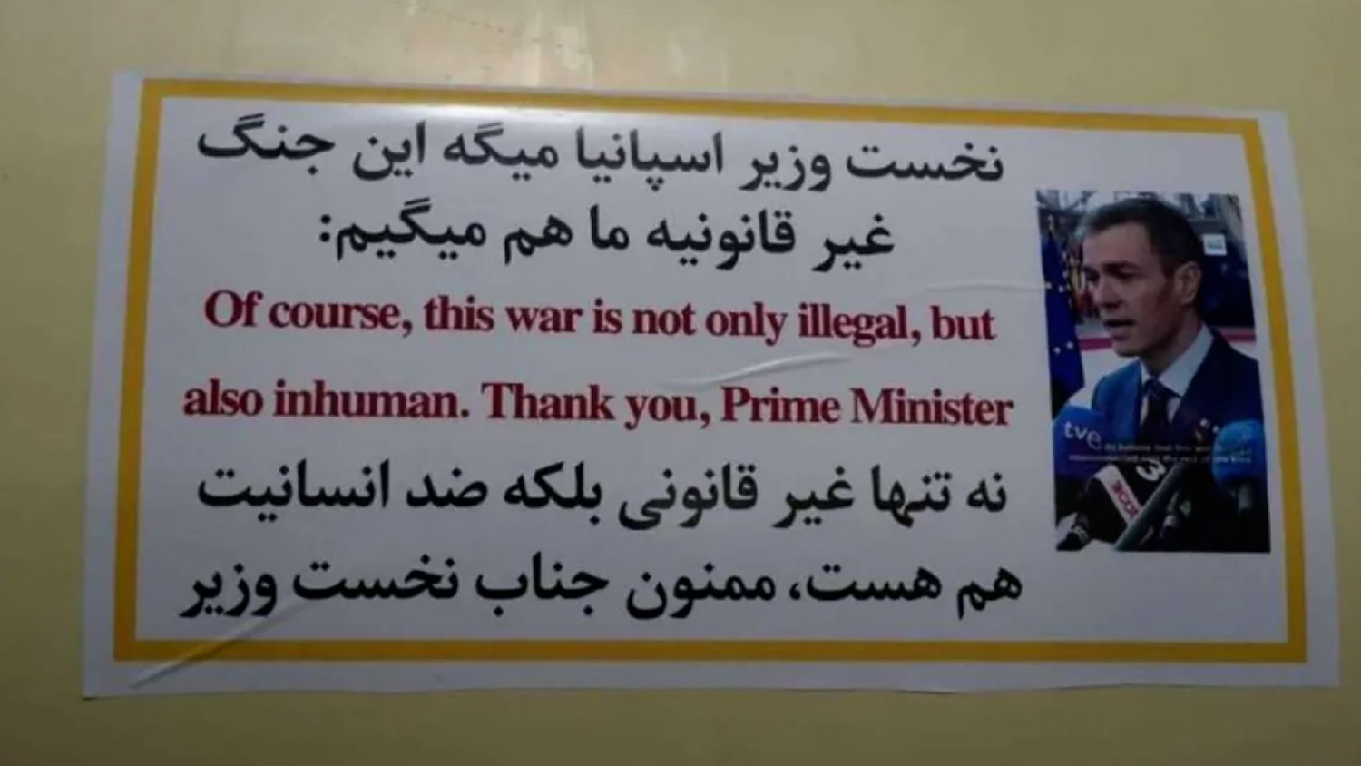 La secuencia no fue un episodio menor ni una anécdota de redes. Según trascendió este lunes, el video fue difundido por medios iraníes y replicado luego por la diplomacia israelí, que acusó al presidente español de haberse convertido, voluntaria o involuntariamente, en insumo útil para la propaganda de los ayatolás. En las imágenes se observa a un integrante de la estructura militar iraní adhiriendo al proyectil una pegatina con el rostro de Sánchez y una leyenda en inglés y en farsi que parafrasea sus palabras contra la guerra. El mensaje agradece al jefe del Ejecutivo español su posición y convierte esa toma de postura en material simbólico de una campaña armada dirigida contra Israel.
