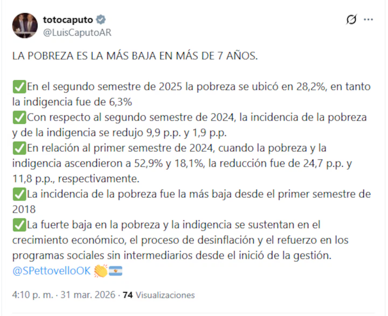 Buenos Aires, 31 de marzo de 2026-Total News Agency-TNA-. La Argentina cerró el segundo semestre de 2025 con una baja importante de la pobreza y la indigencia, en un dato que el Gobierno buscará capitalizar políticamente, pero que al mismo tiempo deja a la vista que el cuadro social sigue siendo delicado, especialmente entre los chicos, en el NEA y en los grandes cordones urbanos. El nuevo informe del INDEC ubicó la pobreza en 28,2% de las personas y la indigencia en 6,3%, con una mejora de 3,4 puntos y 0,6 puntos respectivamente frente al primer semestre del año pasado. El ministro de economía, Luis Caputo anuncio que “la pobreza es la más baja en mas de 7 años”.