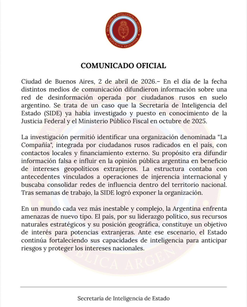 Buenos Aires-3 de abril de 2026-Total News Agency-TNA- La denuncia presentada por el abogado Jorge Monastersky ante la Justicia Federal volvió a poner en primer plano una amenaza que durante demasiado tiempo fue subestimada en la Argentina: la penetración de operaciones extranjeras de desinformación en el ecosistema mediático y digital local. El planteo judicial, ingresado este viernes, pide investigar si existieron estructuras organizadas vinculadas con la Federación de Rusia que buscaron influir en la opinión pública argentina mediante la infiltración de contenidos, el eventual pago a intermediarios y la manipulación del debate público, en un esquema que, de comprobarse, podría encuadrar en delitos previstos por la Ley 25.520 de Inteligencia Nacional. La presentación no nació de un rumor ni de una simple controversia periodística: tomó impulso luego de un comunicado de la SIDE del 2 de abril, citado en la denuncia, según el cual ya se había informado a la Justicia Federal y al Ministerio Público Fiscal sobre las actividades de una organización apodada “La Compañía”, integrada por ciudadanos rusos con recursos internacionales y nexos en el país.