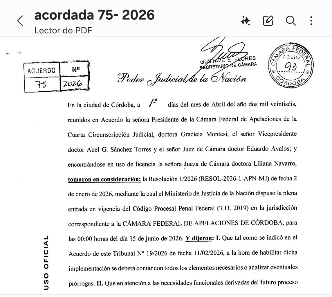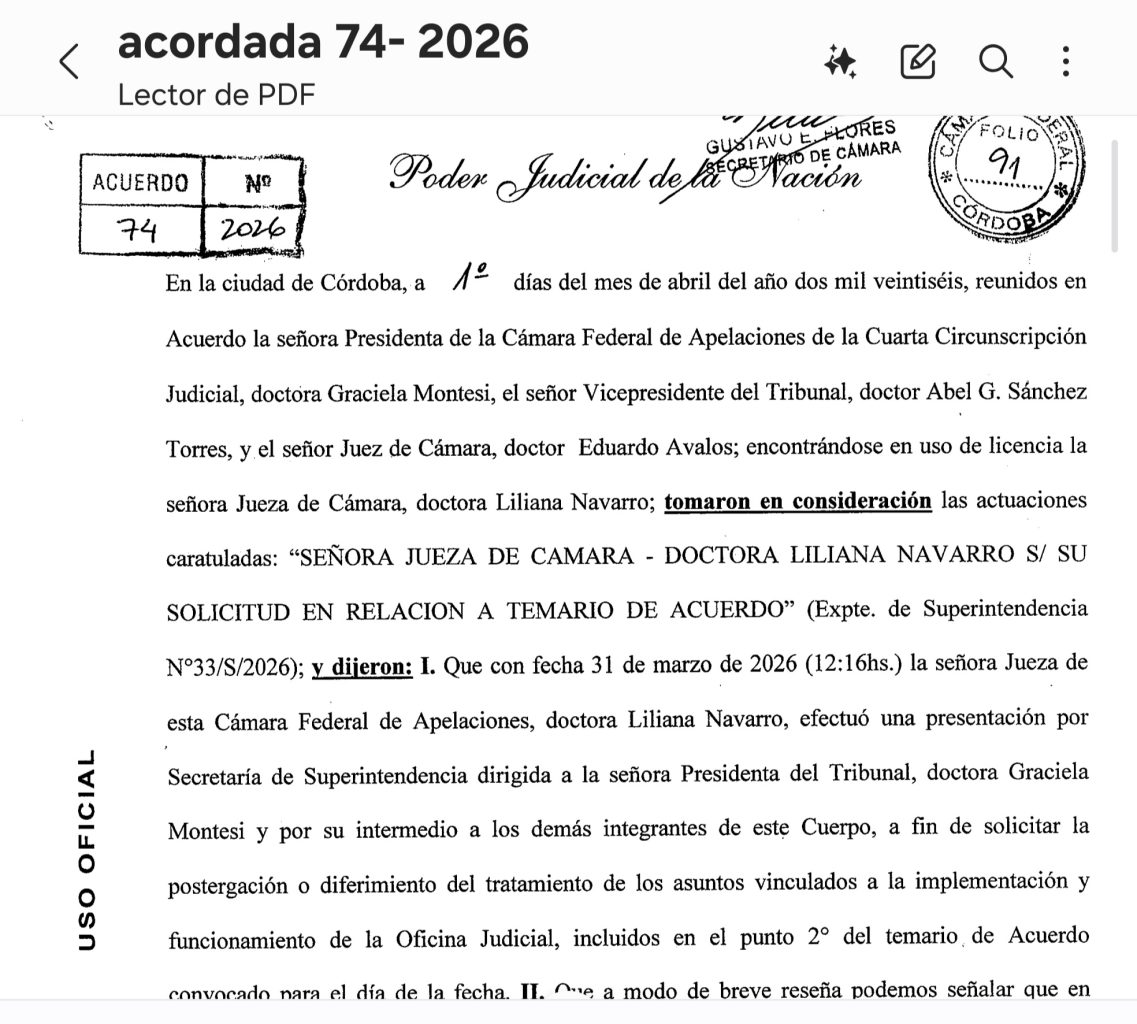 Córdoba, 17 de abril de 2026-Total News Agency-TNA- El escándalo que envuelve a Abel Sánchez Torres y Graciela Montesi sumó ahora un episodio que, lejos de bajar la tensión, volvió a encender alarmas dentro del fuero federal cordobés. En el corazón de esa nueva polémica quedaron las acordadas 74 y 75 de la Cámara Federal de Apelaciones de Córdoba, una secuencia que primero rechazó el pedido de la jueza Liliana Navarro para postergar una reunión de acuerdo y, de inmediato, habilitó el tratamiento y la designación de Ezequiel López Messio al frente de la nueva Oficina Judicial del distrito. En otro contexto el trámite podría haber sido leído como una decisión administrativa. En el actual, quedó bajo una luz mucho más inquietante.