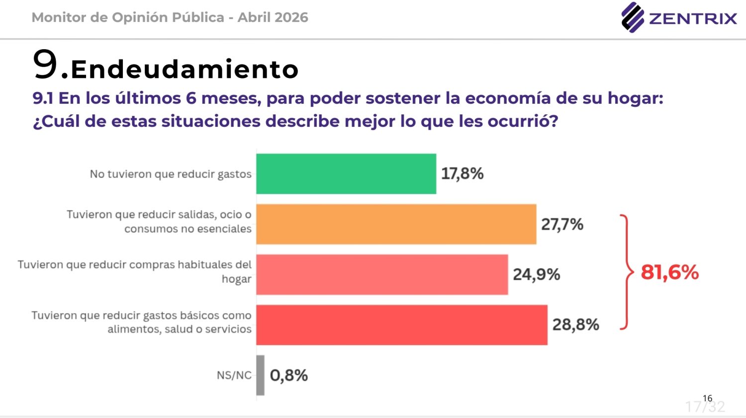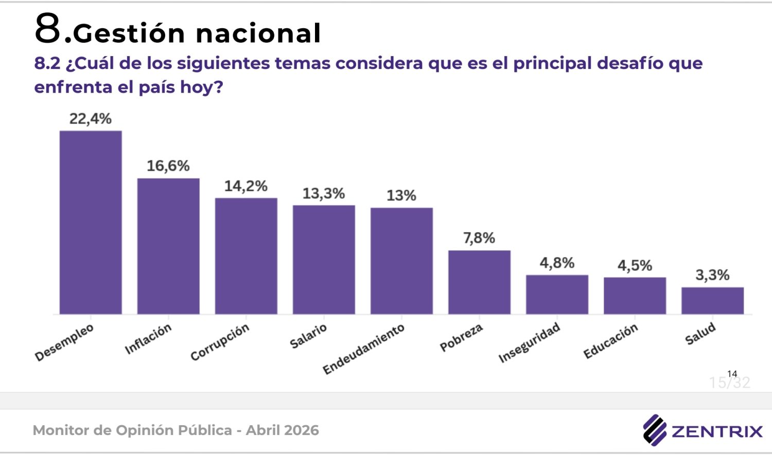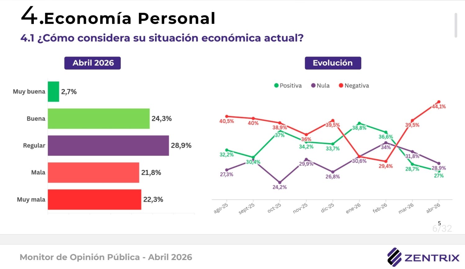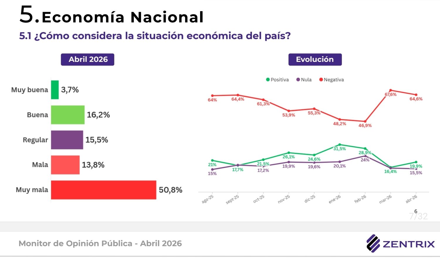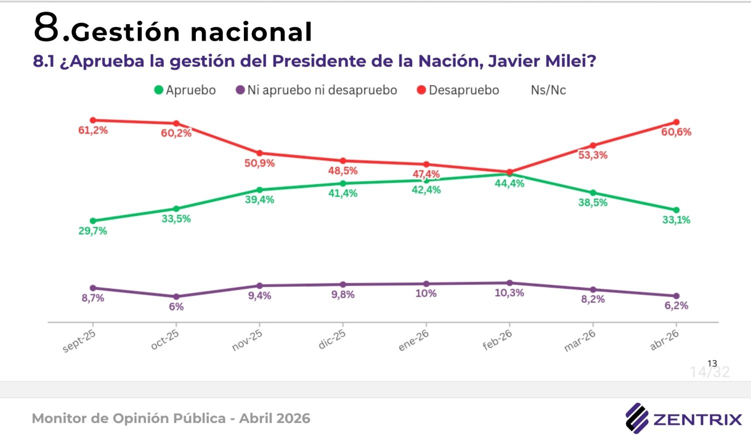 El Monitor de Opinión Pública de abril de 2026, elaborado por Zentrix Consultora sobre 1.559 casos en las 24 jurisdicciones del país, revela que el 60,6% desaprueba la gestión presidencial, mientras que solo el 33,1% la aprueba. El trabajo fue realizado entre el 11 y el 18 de abril, con cobertura nacional, modalidad online y ponderación por región y edad.