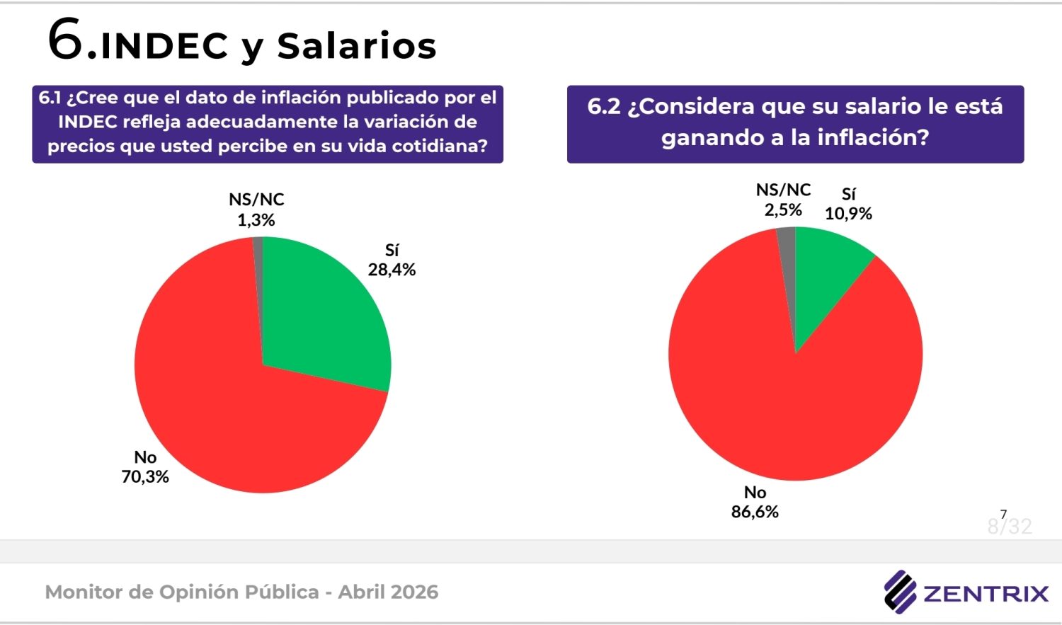 El dato más duro aparece en la economía cotidiana: el 86,6% afirma que su salario no le gana a la inflación y el 70,3% considera que el dato publicado por el INDEC no refleja adecuadamente la suba de precios que percibe en su vida diaria. Además, el 60,4% de los consultados llega apenas hasta el día 20 del mes con sus ingresos o incluso antes.